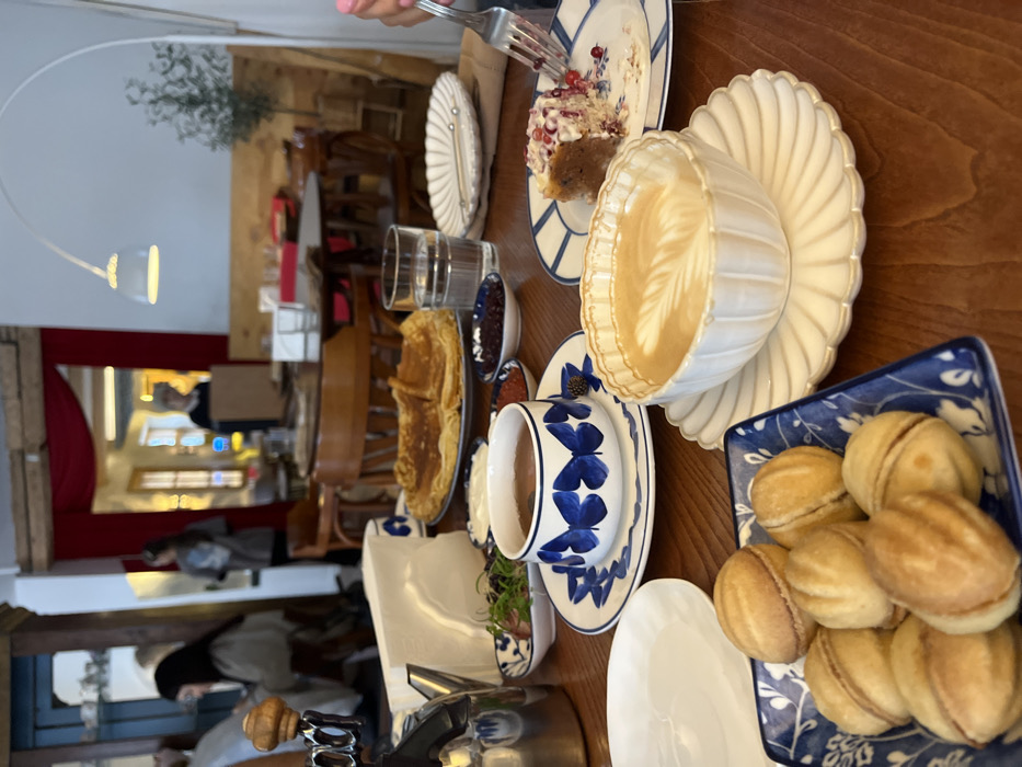 A dining table is set with an assortment of treats. Pancakes, a slice of cake with pomegranate seeds, and pastries filled with cream are visible. Hot beverages, including a latte and a cup of tea adorned with blue butterflies, are also present. Glassware and serving dishes complement the spread. A fork is poised over the cake, ready to take a bite. The setting suggests a cozy café or brunch experience.