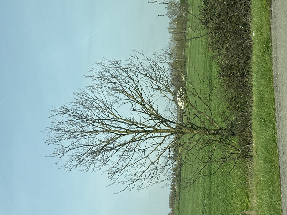 The image depicts a rural landscape within Brentwood, United Kingdom, under a light blue, mostly clear sky. The foreground shows a narrow strip of dark grey asphalt, likely a road edge, transitioning into a vibrant green grass verge. A prominent, tall deciduous tree, devoid of leaves, stands centrally in the midground, its grey-brown trunk and branches featuring patches of lighter green. To the right of this tree, a dense, dark scrub with sparse, small foliage extends horizontally. Behind these foreground elements lies a vast field of uniformly green, low-growing vegetation, indicative of crops. In the background, a detached, light-colored, two-story house with a dark roof is visible within the green field, positioned to the right of the central tree. A distant treeline, also appearing largely bare, defines the horizon. No people or observable actions are present. The bare trees suggest the season is late winter or early spring.