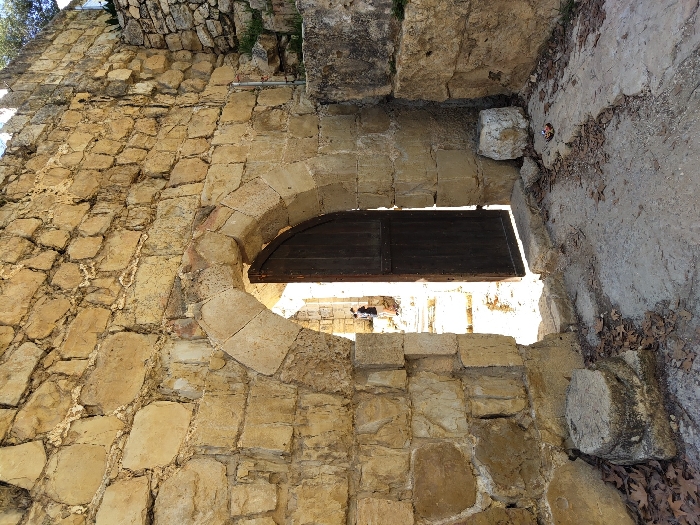 The image displays an exterior view of an ancient stone structure located within the Mate Yehuda Regional Council, Israel. A robust wall, constructed from large, irregularly shaped, light-colored rough-hewn stones, dominates the frame. Centered within this wall is an arched entryway, fabricated from more precisely cut light-brown stones. A dark, single-panel wooden door, hinged on the left, is ajar within this archway, revealing a brightly sunlit interior beyond. Through the open doorway, two individuals are observed in the mid-ground, walking away from the viewer. One person wears a dark top and light-colored trousers. The immediate foreground consists of an uneven dirt and stone ground surface, partially covered with dry, fallen brown leaves. To the left of the archway's base stands a weathered, cylindrical stone pillar, while a rough, squarish stone block rests to the right. Adjacent to this block, on the ground, lies a small, colorful item exhibiting red and orange hues. Partial blue sky is visible at the top right, suggesting clear daytime conditions.