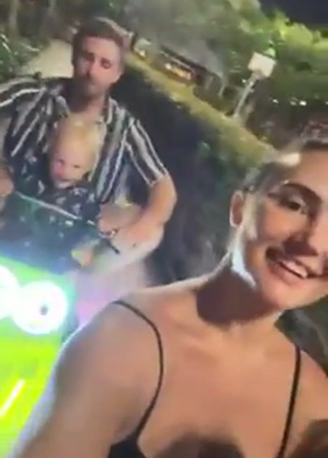 At night, a woman records a video of a man riding a lime green scooter with neon lights on a sidewalk. The man holds a toddler in front of him. The sidewalk is tiled with a light grey repeating pattern. Trees and bushes are visible in the background, along with streetlights. The man wears a striped shirt, and the woman wears a spaghetti strap tank top. She holds the camera toward her, smiling and giggling. The video is blurry.