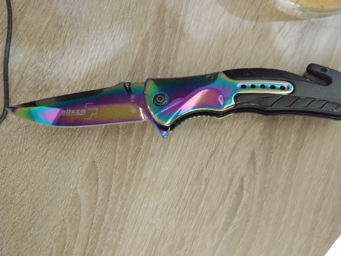- "A multi-tool folding knife, exhibiting an iridescent rainbow finish on its blade and a portion of its handle, rests horizontally on a light-colored wooden surface in the city of Manole, Bulgaria" by FM-syvtp1, licensed under CC BY 4.0