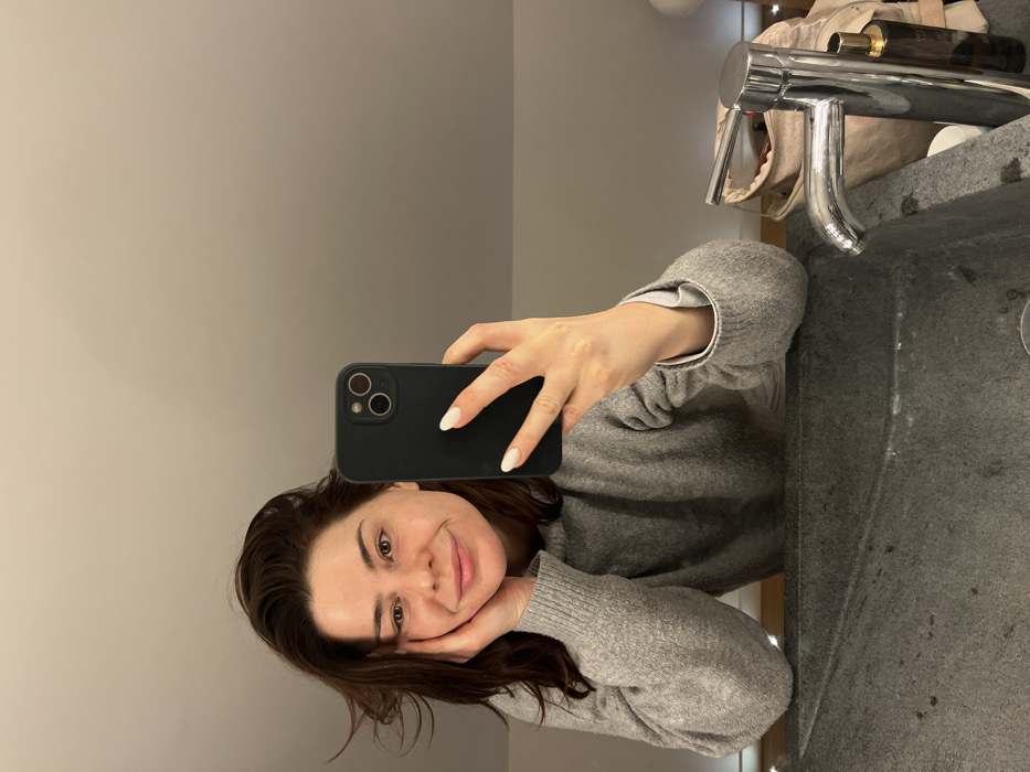 A woman with brown hair and a gray sweater takes a selfie in a bathroom