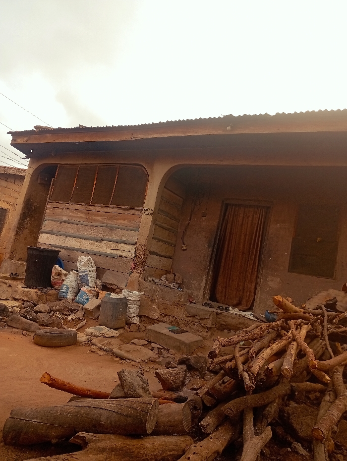 The scene depicts an unpaved outdoor area in Adankolo, Nigeria, in front of a single-story building under an overcast sky. The ground consists of reddish-brown earth and scattered rocks. In the foreground, a large pile of varied-sized chopped firewood and logs is present, along with a single dark tire to the left. The building's facade is constructed of faded light brown concrete or plaster, topped by a corrugated metal roof with a slight overhang. The building features a recessed entrance area. To the left within this recess, a wooden double door or gate with a mesh pattern is visible. Adjacent to it, a dark cylindrical plastic bin and several white sacks, possibly containing goods, are stacked on a raised, uneven platform of rocks and concrete. Text, possibly "ANWA & UMARU," is written vertically on the wall between the two openings. To the right, a doorway is obscured by a dark brown fabric curtain, with a small, dark rectangular window set into the wall above it. A pair of dark sandals are positioned on the step directly in front of the curtained doorway. Electrical wires are visible across the upper left portion of the image. No people or overt actions are depicted.