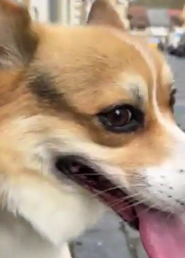 A close-up video shows a tan, white, and black corgi dog walking on a cobblestone street. The dog is panting with its tongue out. Buildings are visible in the background and cars are parked on the street.