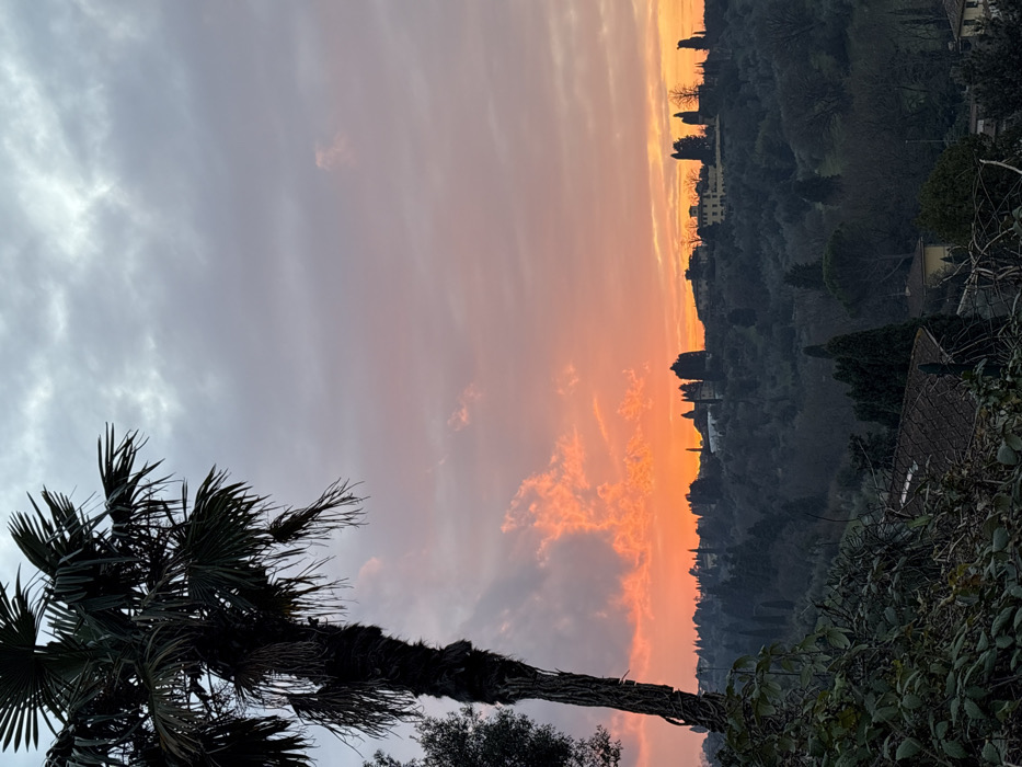 This image captures a sunset over the hilly landscape outside Florence, Italy. The sky is characterized by a gradient of color, starting with a pale gray-blue and light pink at the top, transitioning to vibrant orange and red hues along the horizon, with several darker cloud formations interspersed. A prominent, dark-silhouetted palm tree with dense fronds occupies the left side of the foreground, extending upwards beyond the frame's edge. Below the palm tree, dense dark green and brown foliage forms the immediate foreground. The midground and background consist of rolling hills, densely covered with various trees, including numerous dark green, slender cypress trees. Scattered across these distant hills are multiple residential or villa-style buildings, mostly silhouetted against the sunset, with some lighter facades discernible. No individuals, specific actions, or interactions are visible within the scene.