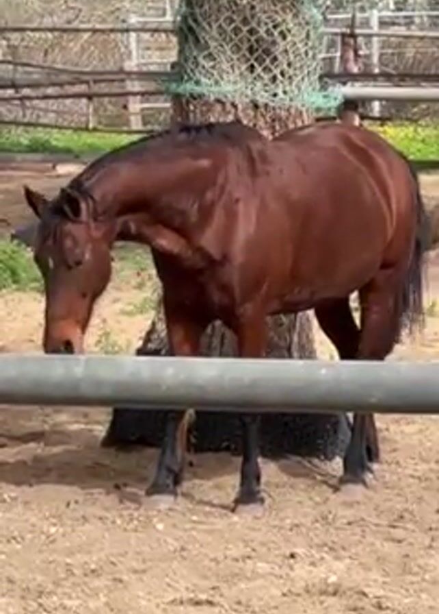 brown horse standing in an enclosure, which appears to be a paddock or small field. The horse is positioned in front of a tree with a green hay net attached to it, suggesting the horse is likely feeding or has recently finished. The ground is sandy. A metal fence surrounds the enclosure. The horse has black legs, a black tail, and a light colored marking on its face. It is standing still.