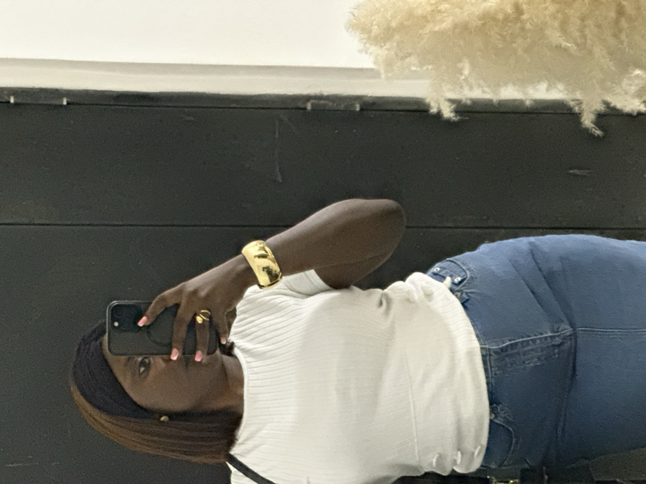 A female individual is depicted in a mirror selfie within an interior space in Karum, Nigeria. She has dark skin, dark bob-length hair with a black headband, and wears a white ribbed short-sleeved top and a blue denim skirt. Her face is largely obscured by a dark-colored smartphone held in her left hand, which displays pink nail polish and a gold ring on the ring finger. A gold-colored cuff bracelet is visible on her right wrist, and a small gold stud earring is present in her left ear. A dark strap is visible over her left shoulder. The background features a dark, paneled wall or door surface to the left, a white wall section to the right, and a light-colored, fluffy decorative plant in the lower right corner.