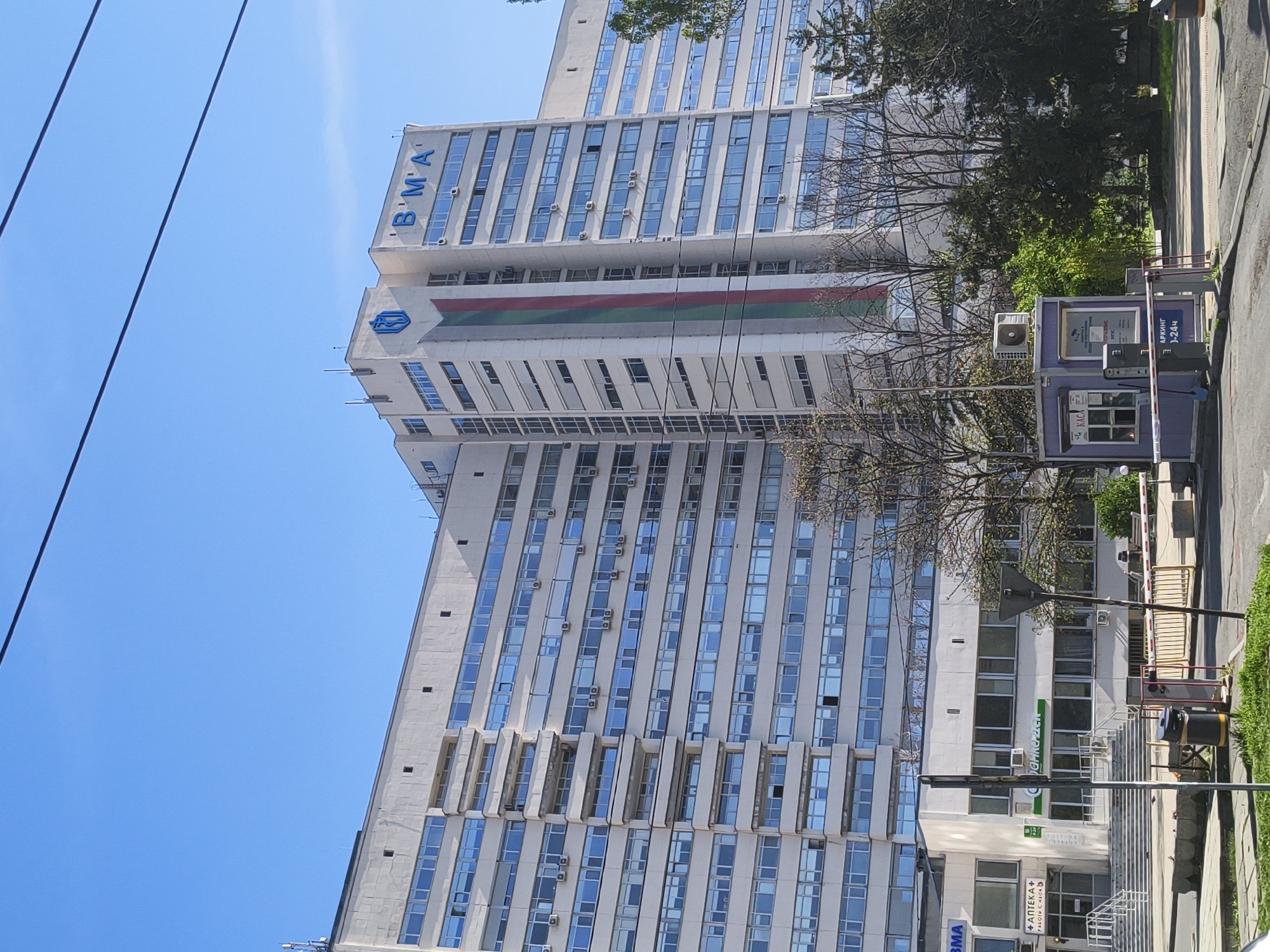 Bulgarian Medical Association (BMA) building in Sofia, Bulgaria. It is a tall, white building with many windows and a large Bulgarian flag emblazoned on its façade. The BMA logo is visible at the top of the building, alongside the letters 'BMA'. A parking kiosk is in the foreground with a sign that includes the word "Parking." The sky is clear and blue. There are trees partially obscuring the building. The photograph is taken from a low angle, looking up at the building. Power lines are visible in the top left of the image. A building at the base of the skyscraper has a sign for a pharmacy.