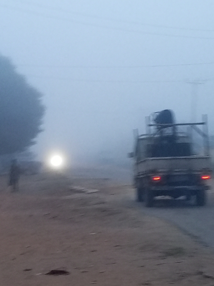 A road scene in Aramoko-Ekiti, Nigeria, is depicted under conditions of dense atmospheric haze or fog