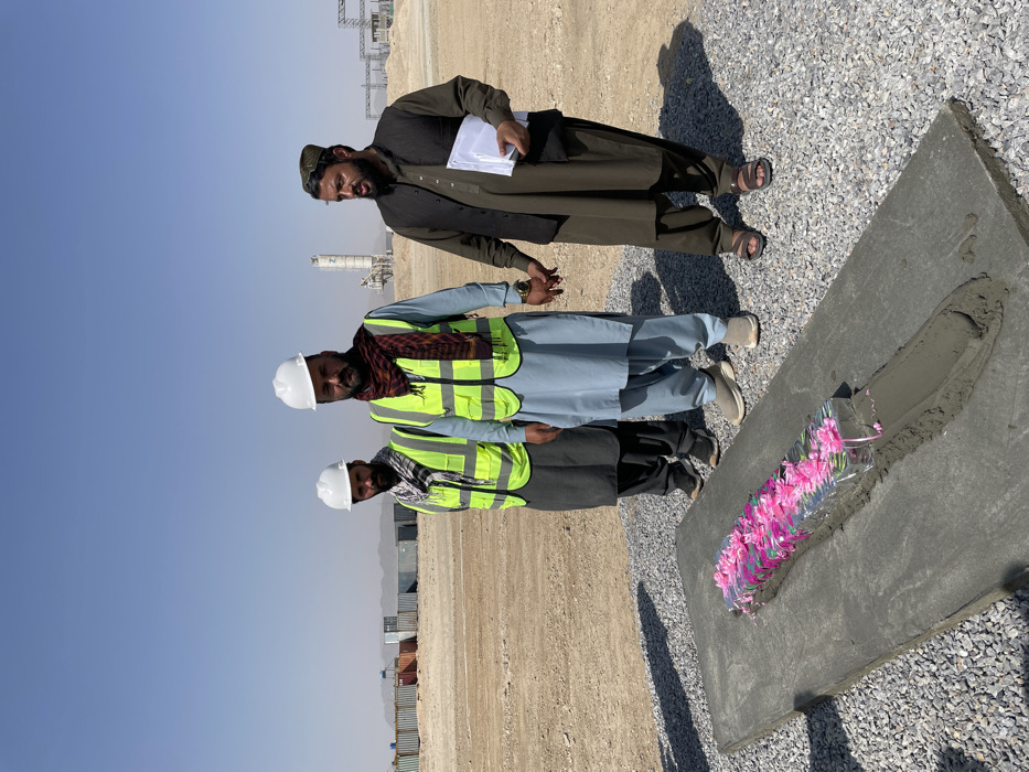 The image depicts three adult males standing on a gravel surface in Pir Dust, Afghanistan, under a clear blue sky at what appears to be a construction or industrial site. In the foreground, a rectangular concrete slab lies horizontally on the ground. A central trough in the slab contains fresh, wet cement, into which a long, narrow object wrapped in reflective silver material and adorned with numerous bright pink artificial flowers or petals has been placed. The three men are positioned behind and slightly to the right of this slab. The two men on the left wear white hard hats and neon yellow safety vests over traditional attire; the middle man also wears a multi-colored scarf. The man on the far right wears a dark waistcoat over olive-green traditional clothing and a dark cap, holding a stack of white papers in his left hand. The man in the center and the man on the right are holding hands. In the background, a flat, dusty landscape extends to a low horizon of hills. Various industrial elements are visible, including multiple shipping containers, tall silos or towers resembling a concrete batching plant, and utility poles or transmission structures. The ground directly beneath the men and the slab is covered in grey gravel, transitioning to dirt and sand further into the background. Shadows indicate direct sunlight.