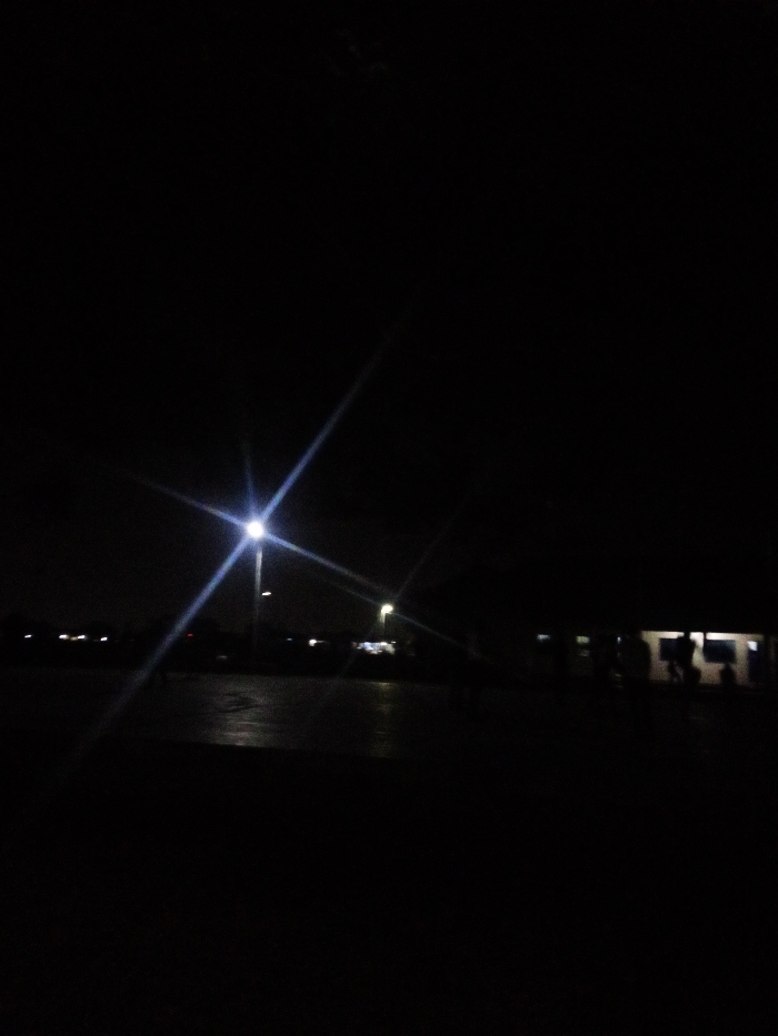 A dark night scene with a bright street light illuminating a flat, reflective surface. Other lights appear in the distance. A building with illuminated windows and indistinct figures stands to the right. The vast majority of the image is dominated by darkness.