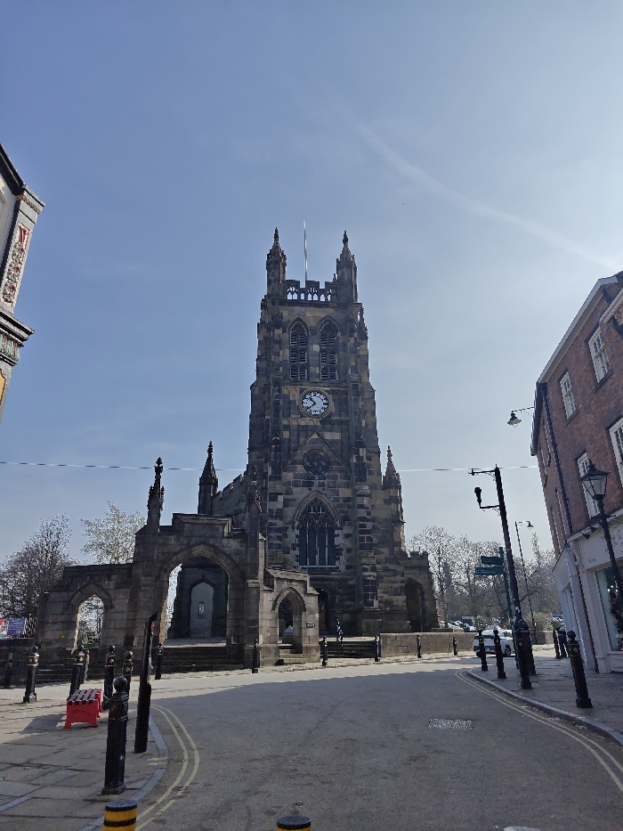 The image depicts a street scene dominated by St. Mary's Church in Stockport, United Kingdom, specifically looking towards the church from Churchgate. In the center, the prominent feature is a tall, Gothic-style church tower constructed from variegated dark stone, exhibiting intricate stonework, arched windows, and a belfry with louvers. A white clock face is visible high on the tower, displaying a time approximating 11:35. The tower is crowned with battlements and multiple pinnacles, with a flagpole extending upwards from the top. To the left of the main tower, a series of stone arches and remnants of what appears to be an older or ruined section of the church are present. The foreground consists of a paved street with double yellow lines indicating parking restrictions. Several dark metal bollards with decorative tops and yellow reflective bands are arranged along the edges of the road and a pedestrian area to the left. A metal drain cover is embedded in the road surface. On the left pavement, a red plastic barrier or crate is visible near the bollards. To the right of the street, a multi-story building constructed of red-brown brick stands, featuring multiple sash windows with white frames and a ground-level shopfront. Traditional black street lamps are visible, both mounted on poles and affixed to the building. In the mid-ground, beyond the church's perimeter, a green directional sign is partially visible, and several parked vehicles are discernible in the distance. Bare deciduous trees are visible behind the church and to its left. The sky is a clear, light blue with subtle atmospheric hazing and faint, high-altitude contrails, indicating bright daylight conditions. No individuals are visible in the immediate foreground or mid-ground.