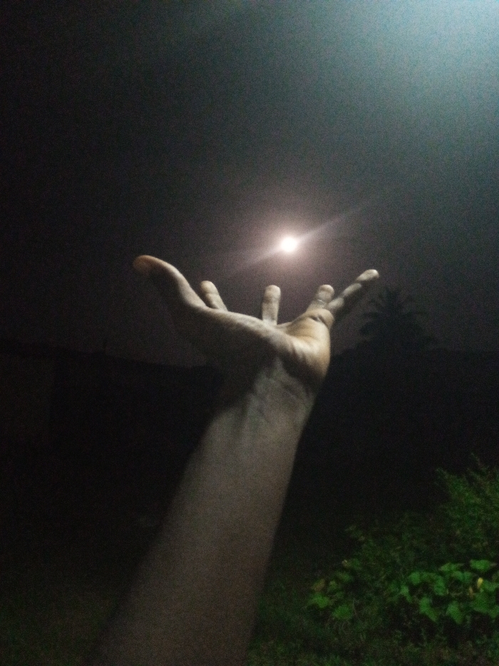This image depicts a nighttime outdoor scene in Narayi, Nigeria. The primary subject is a human right arm, visible from below the elbow, extended upwards towards the center of the frame. The hand is open with fingers splayed, oriented with the palm facing upwards. Above and slightly to the right of the hand, a bright, circular light source, consistent with the moon, is visible against a dark sky, emitting visible light rays. In the background on the right, dark silhouettes of trees or tall vegetation are present. The lower right foreground shows faint green vegetation. The scene is largely dark, with the moon providing the main illumination.