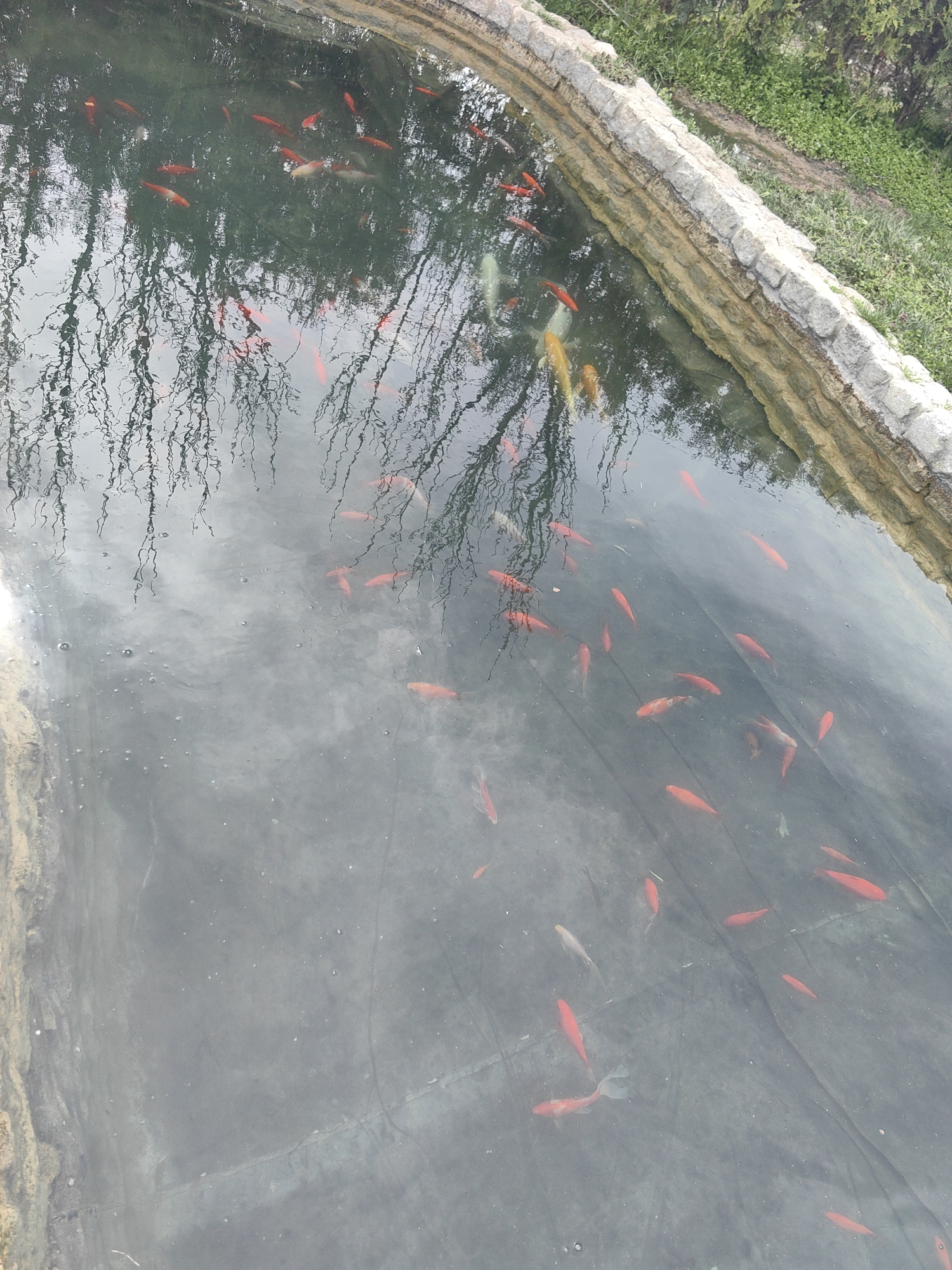 An overhead view depicts a rectangular outdoor pond located in Saedinenie, Bulgaria. The pond features a visible dark grey liner or bottom, partially obscured by surface reflections of bare tree branches and an overcast sky. The right edge of the pond is lined with a dry-stacked stone wall, composed of irregular light-colored stones, transitioning to a yellowish-brown stained lower section. Beyond this wall, green grass and dense green foliage are visible, alongside a narrow dark strip. The pond contains approximately 50-70 goldfish or small koi, predominantly bright orange-red, with several individuals appearing white, light yellow, or variegated. These fish are observed swimming throughout the clear water. Small air bubbles are visible on the water surface in the lower-left quadrant. No individuals are present.