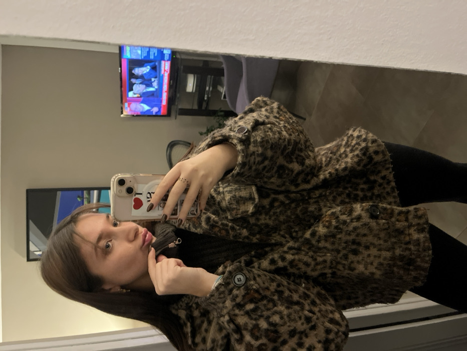A young woman takes a selfie in a mirror, wearing a leopard print jacket
