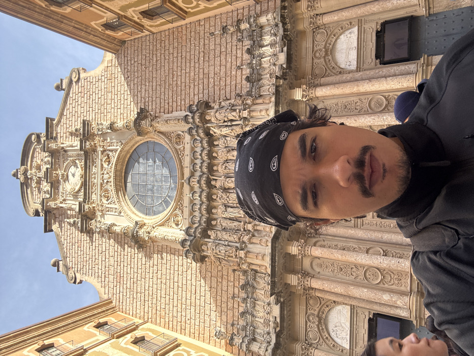 The image depicts a male individual in the foreground taking a photograph of himself in front of the Basilica de Montserrat, located in Monistrol de Montserrat, Spain. The male subject, positioned centrally, has dark hair, a mustache, and a goatee, and is wearing a black bandana with white patterns and a black zip-up jacket. He looks directly at the camera with a neutral expression. To his immediate left, the profile of a female's face is partially visible. Further back, another individual's head, topped with a blue cap, is partially visible behind the primary subject's right shoulder. The background is dominated by the ornate, light-colored stone facade of the Basilica de Montserrat. This multi-tiered facade features classical architectural elements, including numerous columns and arched openings at the lower level. Above the main entrance area, a horizontal row of multiple carved stone statues stands in niches. Centrally positioned above the statuary is a large circular rose window with intricate tracery. The uppermost section of the facade includes a clock face with Roman numerals, set within decorative carvings. Parts of multi-story buildings with windows and small balconies flank the basilica on both the left and right sides. The scene is illuminated by natural sunlight, under a clear blue sky. A modern display screen is mounted above a dark doorway on the lower right section of the basilica's facade.