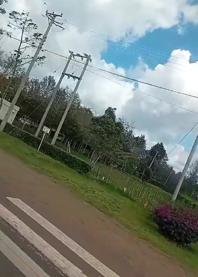 woman on the side of a rural road walking towards the camera. She's wearing a printed top, a dark skirt, and black shoes, and carries a blue bag. The camera pans to the left, showing a green ATM kiosk, more of the road, and trees lining the street. Two children are seen crossing the street. The sky is partly cloudy.