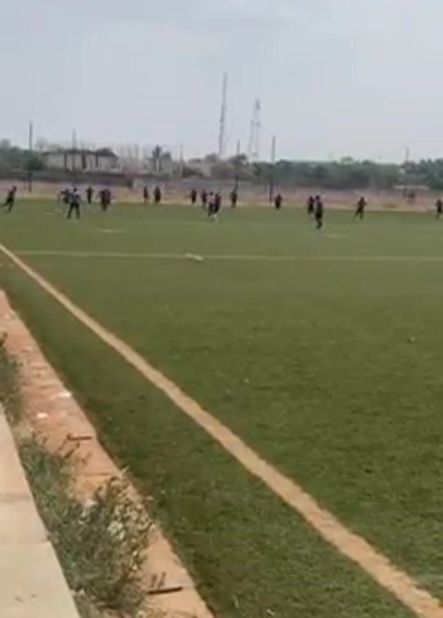 On a sunny day, a group of people are playing soccer on a green turf field. They are wearing various dark-colored athletic clothes. The field has white lines marking the boundaries. In the background, there are some buildings under construction and a few utility poles. The camera is positioned on the sidelines, close to a concrete barrier.