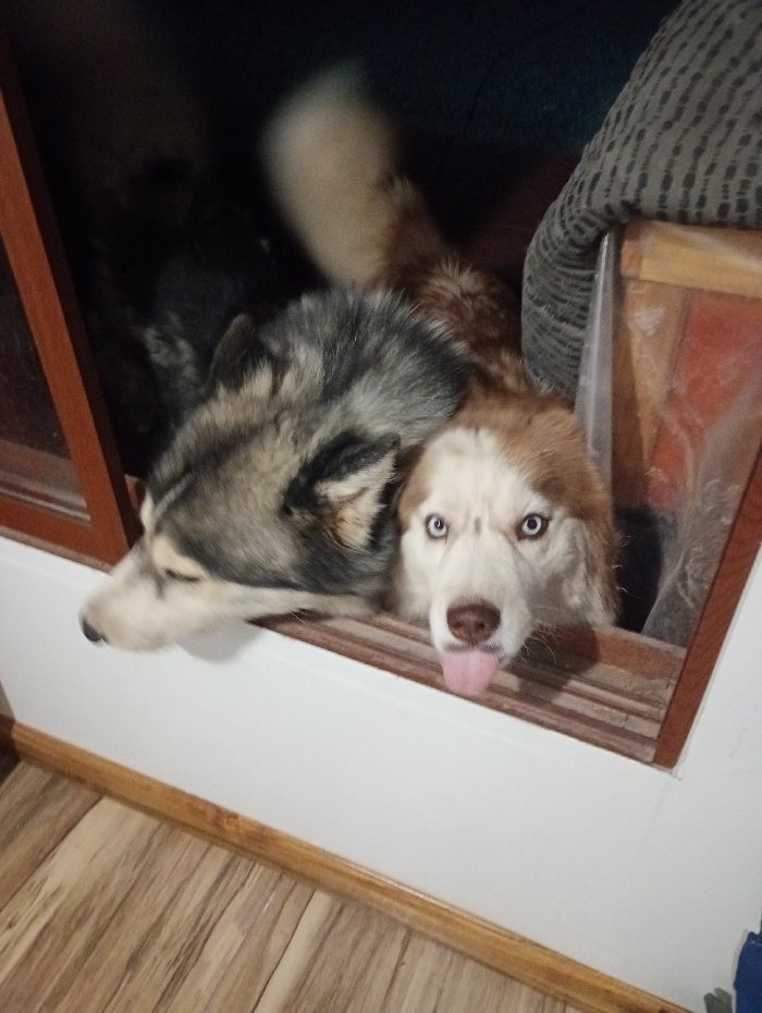 - "Two huskies peek from a wooden window frame" by FM-skUe82, licensed under CC BY 4.0