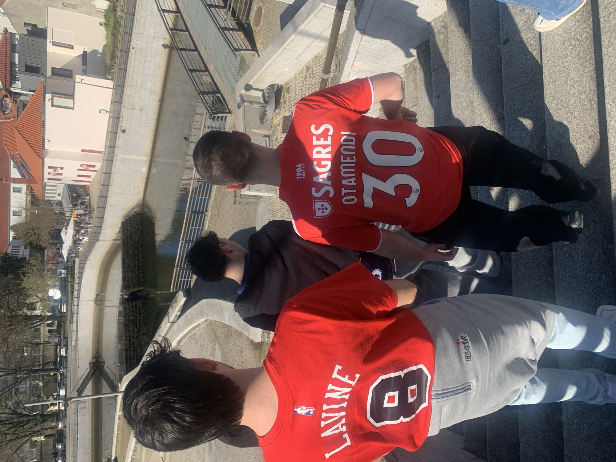 The image depicts an outdoor urban scene along the River Fervença in Bragança, Portugal, likely near the Jardim da República or Mercado Municipal. Three individuals are observed from behind, descending a set of wide, grey stone steps. The leftmost individual wears a red t-shirt with "LAVINE 8" and an NBA logo on the back, layered over light blue jeans and light grey sweatpants featuring a "GESTÃO" logo. The individual in the center is partially obscured, wearing a dark hooded jacket and dark trousers. The rightmost individual wears a red football jersey displaying "1904 BENFICA SAGRES OTAMENDI 30" on the back, paired with black trousers. A fourth person's lower right leg and shoe are visible at the far right. To the immediate right of the descending stairs, a metal handrail is present, ending near a cylindrical, ribbed metal structure on a lower stone platform. Below the stairs and extending into the midground is a paved pedestrian area bordered by a concrete-capped stone retaining wall that lines a body of water, consistent with the River Fervença. Multiple metal pedestrian bridges traverse the river, with one visible on the mid-right and another in the distant background. The water exhibits a low level, revealing terraced concrete structures at its edge in the background. Beyond the river, a street with parked vehicles and large, deciduous trees runs parallel to the waterway. Various buildings, some featuring traditional terracotta roofs and light-toned facades, others with modern grey cladding, are visible in the background. A public space with white sun umbrellas and outdoor seating areas suggests the presence of cafes or restaurants. The scene is illuminated by bright sunlight, casting sharp shadows across the steps and ground, indicating clear weather conditions.