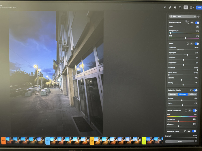 The image depicts a photograph displayed on a digital monitor, captured in the city of Parvomai, Bulgaria. The photograph portrays an urban street scene during twilight or dusk, characterized by a deep blue sky with faint cloud formations and illumination from active streetlights. The perspective is from a paved sidewalk, looking along a street bordered by multi-story buildings. On the immediate right, a building with large reflective windows and multiple exterior air conditioning units is visible. A flag, featuring vertical red, yellow, and blue stripes (Romanian flag), hangs from this building or an adjacent pole. To the left, a building facade is partially obscured by trees, street furniture, and parked vehicles. The sidewalk is constructed from interlocking pavers and features outdoor seating arrangements, including tables and chairs, suggesting a cafe or restaurant. Several illuminated streetlights are prominent along the pathway. In the mid-ground and background, multiple indistinct human figures are discernible on the sidewalk, indicating pedestrian activity. Further down the street, a building with a distinct spire or tower is visible against the horizon. The photograph is presented within a photo editing application interface, with a panel on the right displaying various adjustment sliders and settings. These include "RAW Layer" controls for "White Balance" (Temperature -93%, Tint 10%), "Basic" adjustments (Exposure -80%, Highlights 27%, Contrast 100%, Black Point -100%, Texture -10%, Clarity 1%), "Selective Clarity" with "Midtones" selected (Texture -6%, Clarity 0%), and "Hue & Saturation" (Saturation -22%, Vibrance -21%). A row of image thumbnails, some labeled "CH," "CF," "ML," and "LS," is visible along the bottom of the screen. The top-left corner of the screen displays text "20 21:18 - 3024 x 4032."