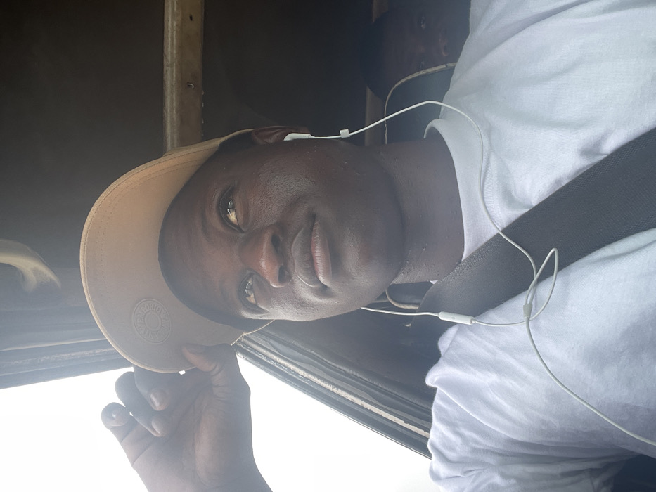 A young man of dark complexion is depicted seated inside a vehicle in Ikota, Nigeria