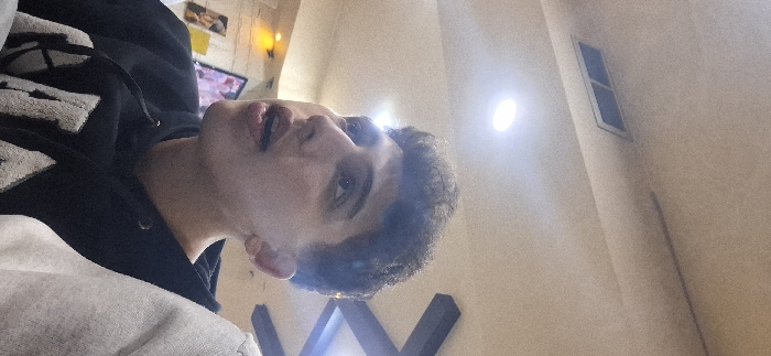 A young man with curly hair is pictured from a low angle. He is wearing a dark hoodie with a white design. A window is seen high on the wall in the background, along with a light fixture. A small picture or frame is visible above a TV screen. The walls are a light beige color. There is a wooden geometric object in the lower part of the frame.
