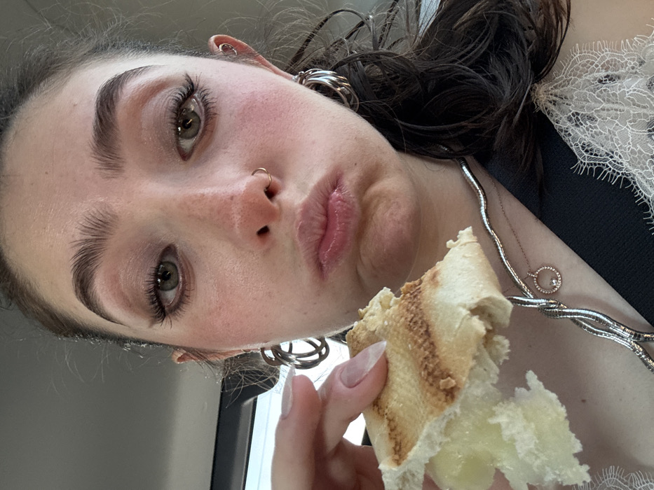 A young woman with fair skin and long, dark eyelashes holds a piece of bread in her hand. She has a nose ring and wears multiple silver necklaces and hoop earrings. Her hair is pulled back, and she has on a black blazer with a lacy white top underneath. The woman's lips are pursed slightly. The background is blurred, suggesting the photo was taken indoors, possibly in a car.
