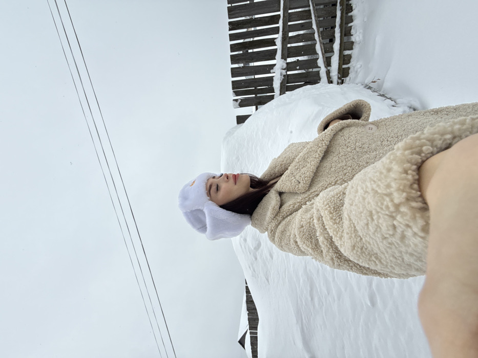 An outdoor winter scene in Ольховка, Russia, depicts a young adult female posing for a self-portrait