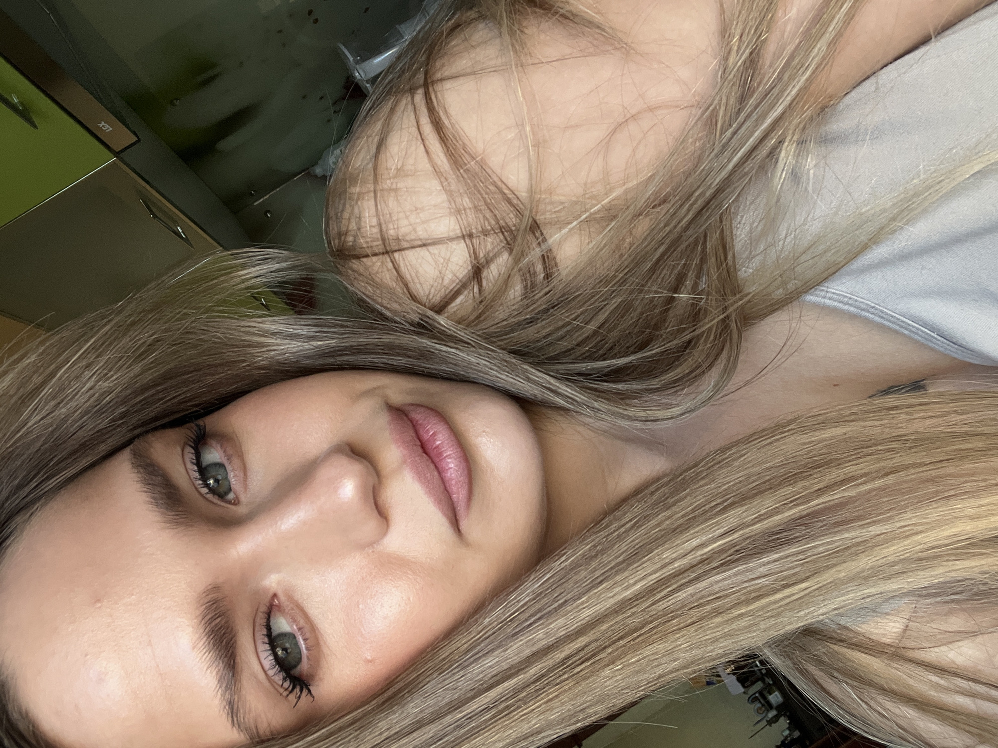 A close-up, angled, and slightly distorted photograph depicts a woman with long blonde hair. Her skin is fair, and she has green eyes, dark eyebrows, and full lips with a pink hue. She appears to be wearing minimal makeup, with visible mascara enhancing her eyelashes. To the top left of the image, a blurred background suggests a kitchen environment, possibly including a light green cabinet with a silver handle. The location cannot be determined from the image, so there is no way to verify if it is in Khimki, Russia. A portion of what appears to be a light gray garment is visible near her shoulder, and a small tattoo is partially visible on her upper chest.