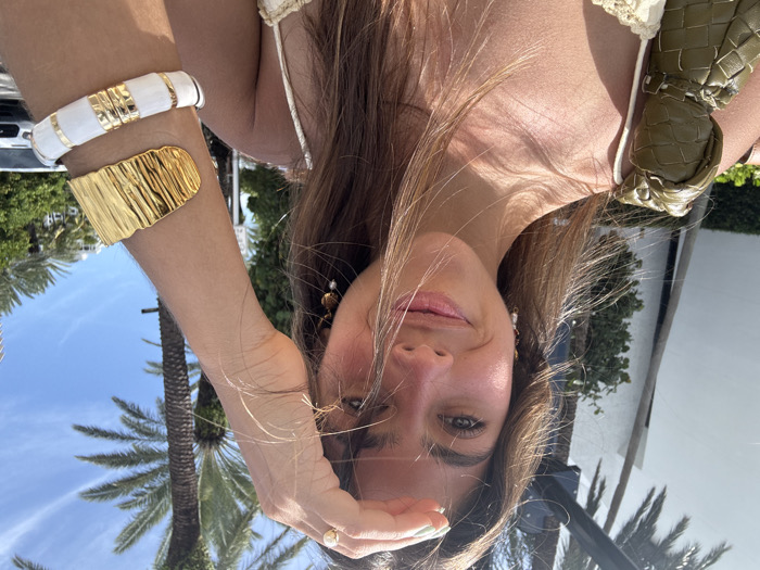 An outdoor, bright daylight image features a young adult female smiling directly at the camera on a street in Bal Harbour Village, United States. The female, with long brown hair, has her right hand raised to shield her eyes from the sun; a gold-toned ring with a light-colored stone is visible on her right ring finger, and her index finger displays light green nail polish. She wears a light-colored, possibly crocheted, thin-strapped top and small drop earrings. Her left forearm displays two bracelets: a wide, gold-toned cuff with a textured finish and a white bangle adorned with gold bands. A green, woven bag is visible over her left shoulder. The background reveals a clear blue sky with scattered clouds, multiple tall palm trees, a white building, and a partially visible white van.