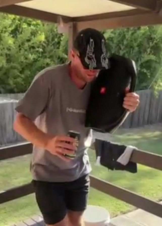 A man in a baseball cap, gray t-shirt, black shorts, and gray Crocs dances on a wooden deck holding a black JBL speaker and a can, possibly a drink