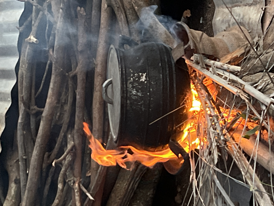 A black cooking pot sits within a crude outdoor fire. Flames lick the bottom of the pot and flicker upwards amidst dry twigs and branches. Smoke wafts around the pot and upwards. The pot has a lid and a metal handle. It is surrounded by the rough textures of wood, ash, and burning vegetation. A corrugated metal sheet is partially visible in the background on the left side.