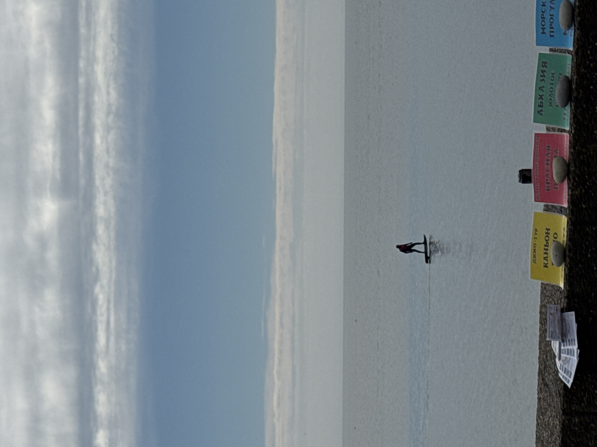 The image depicts a windsurfer on the Black Sea. The sky is partly cloudy. The horizon line is a straight, indistinct demarcation between the sky and the water. The scene includes an individual on a windsurfing board, located relatively far from the camera. Along the right edge of the image are several miniature books, which may indicate the photograph was taken from an elevated position, possibly a balcony or ledge. These miniature books are stacked, and some are topped with small stones. The scene is likely in the city of Sochi, Russia, based on the Cyrillic text on the book spines.