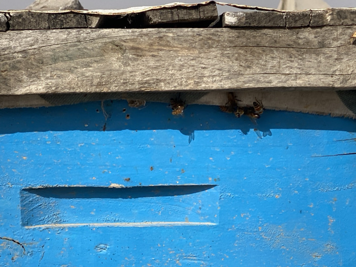 - "The image displays a close-up view of a weathered blue beehive in Nakhonay, Afghanistan" by FM-B5wmg2, licensed under CC BY 4.0