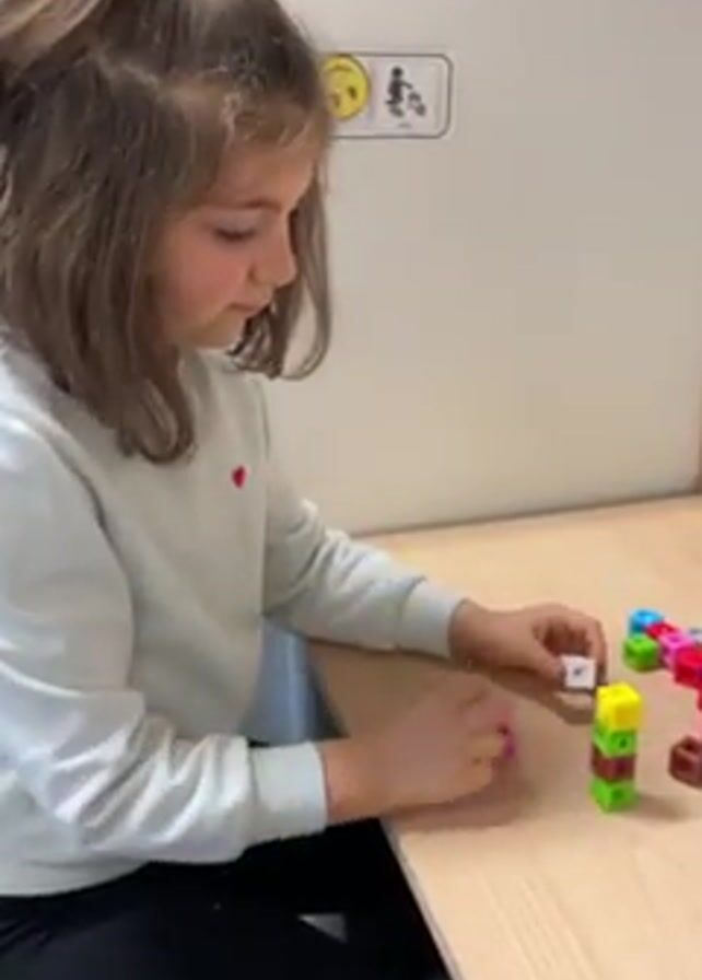 A young girl is seated at a light brown table in what appears to be an indoor setting. She has light brown hair pulled back into a ponytail. She is wearing a white long-sleeved shirt with a small red heart on the chest and black leggings. On the table are several colorful interlocking plastic cubes. She is stacking the cubes to create a tower. A sign with a smiley face and a person in a wheelchair is on the wall behind her. Part of another person's blue-jeaned leg can be seen in the lower left corner of the frame. The camera is mostly static.