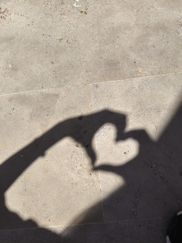 The image captures a high-angle view of shadows cast upon a light grey, granular paved surface in Mechouar Kasbah, Morocco. The primary subject is a dark, distinct shadow formed by two hands positioned to create a heart shape, located centrally on the right side of the frame. To the left, an elongated, less defined shadow of an arm extends towards the heart shape. Additional shadows include a broad, dark area in the lower right corner, partially obscuring the pavement, within which the black tip of a shoe or sneaker is visible. The paved surface, likely concrete or stone, displays visible grout lines, minor scuff marks, and scattered small debris, indicative of an outdoor, sunlit environment.