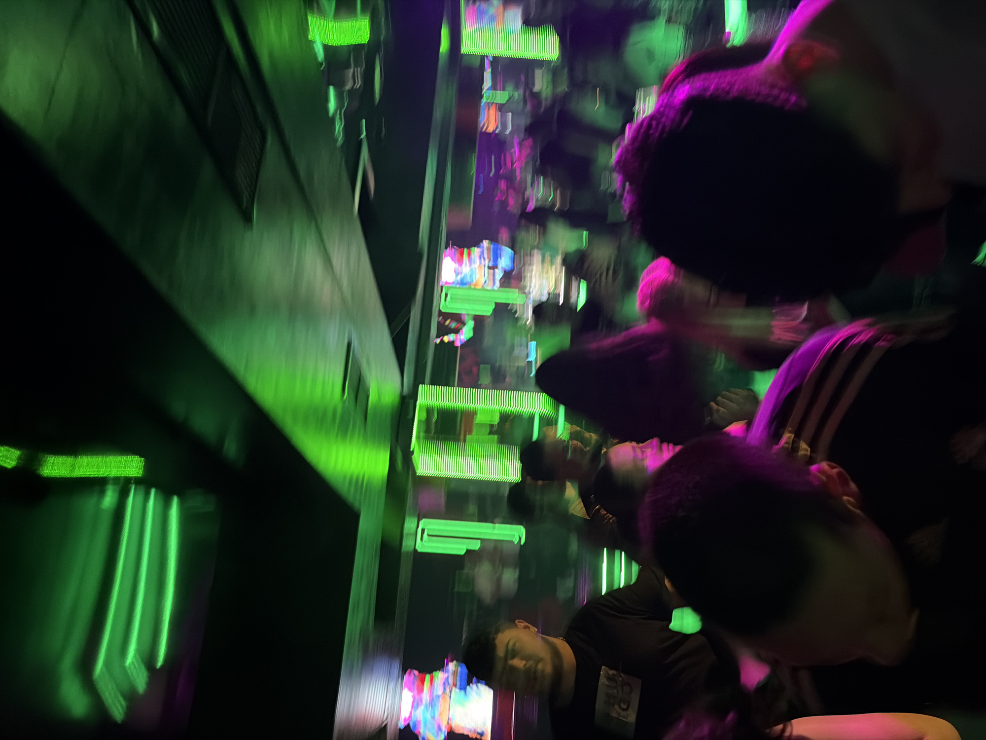 The image depicts an indoor nightclub or bar environment, located in Varna, Bulgaria. The scene is characterized by intense artificial lighting, predominantly neon green from linear ceiling fixtures and vertical wall strips, supplemented by distinct pink and purple light sources. Significant motion blur affects most subjects and light trails, indicating movement and a low-light photographic setting. A dense crowd of approximately two dozen individuals is visible, with varying levels of clarity. In the mid-left foreground, a male subject with short, dark hair, a beard, and a visible gold chain is moderately clear, wearing a dark t-shirt with a light graphic and looking towards the left of the frame. The remaining individuals are largely indistinct due to blur, appearing as silhouettes or forms in the crowded space. Some figures show characteristics of casual attire. The ceiling is dark, featuring multiple horizontal fluorescent or LED light fixtures emitting green light, alongside discernible ventilation grates. In the background, vertical green light elements are arranged, suggesting architectural columns or decorative light panels. Several screens or displays emit abstract, colorful patterns, contributing to the club atmosphere. No specific actions or direct interactions between individuals are clearly discernible beyond general standing and movement within the crowded venue.