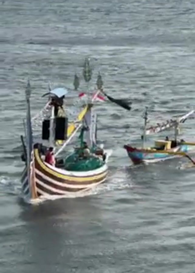 two small, colorful fishing boats moving through choppy, gray ocean water. The boat in the foreground is primarily brown and white, with colorful accents. It is adorned with decorations including miniature flags, streamers, and what appear to be speakers stacked high. Several people are visible on board, some wearing red shirts. The boat leaves a white wake behind it. The second boat, smaller and more brightly colored with red and blue, follows closely. The sky is overcast and pale in the background.