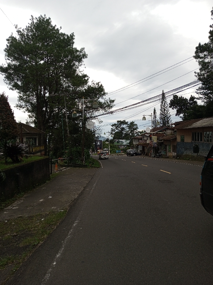 The scene depicts a moderately busy street in the city of Adhanur, India, under an overcast sky. The asphalt road, marked with double yellow solid lines that transition to dashed, runs from the foreground towards the background, curving slightly to the left. On the left side, a paved sidewalk abuts a low concrete wall with a patch of grass, beyond which a large, dense conifer tree dominates the left frame. A single-story building with a brown roof is partially visible behind the wall and trees. A decorative streetlight pole with multiple lantern-style fixtures stands on the left, connected to a dense network of overhead wires that crisscross the street. An orange traffic cone is visible near the base of this pole. In the midground, a silver multi-purpose vehicle travels away from the viewer on the right lane of the road. Several other vehicles, including a dark SUV and another dark sedan, are parked on the far side of the street near various commercial and residential buildings. These structures display varied architecture, with one notable building featuring a blue tiled facade below and a brown section with windows above. Another streetlight pole, similar in design to the one on the left, is positioned further down the road on the right. Tall, dark green trees line both sides of the street and extend into the distance. The background reveals distant hills or mountains beneath the cloudy horizon. No discernible people are visible. A portion of a dark vehicle is cropped into the extreme right foreground.