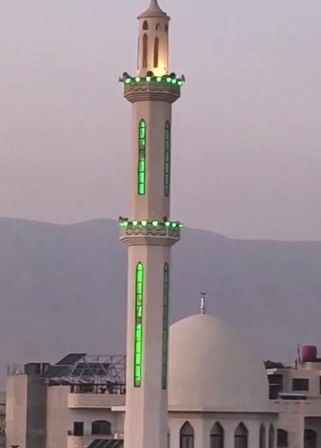 A medium, full shot captures a mosque's minaret and dome. The minaret, positioned prominently in the center, is illuminated with green lights along its length and a soft golden glow emanating from its top. A silver crescent moon adorns the dome of the mosque. The background features rooftops of surrounding buildings and a mountain range in the distance. The sky is a muted, light color, suggesting either early morning or late evening. The camera is static, maintaining a fixed viewpoint throughout the duration of the shot.