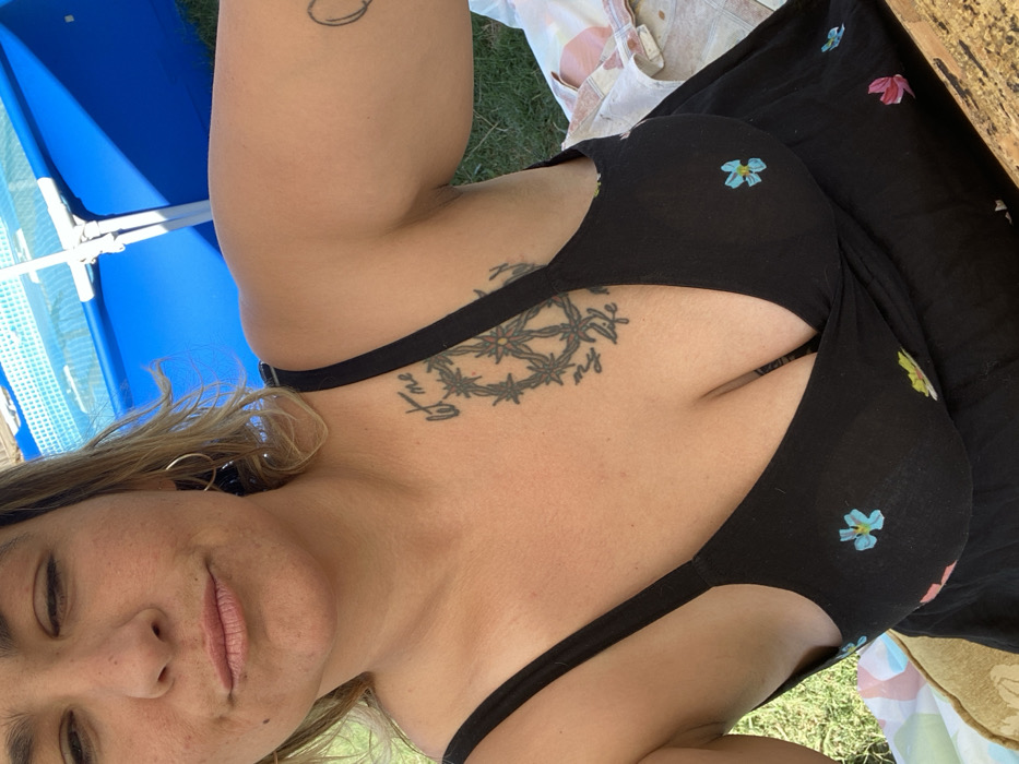 A woman reclines in a black floral dress, revealing a tattoo on her upper chest and shoulder. The tattoo depicts barbed wire in a circular shape with text. She wears hoop earrings and has blonde hair. A blue kiddie pool sits nearby, hinting at an outdoor, casual setting. She gazes down toward the camera. The sun appears to be shining and the overall impression is relaxed and carefree.