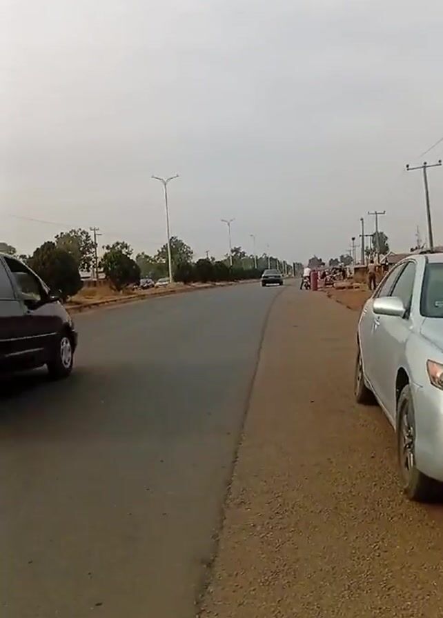 The camera is static, offering a view down a straight road. The road is paved on the left side and unpaved on the right. A light silver sedan is parked on the right side of the road, facing the camera. In the distance, cars and a minivan are traveling down the road. On the right side of the road, a small group of people are visible near some makeshift structures. There are utility poles with power lines running along the right side of the road. The sky is overcast.