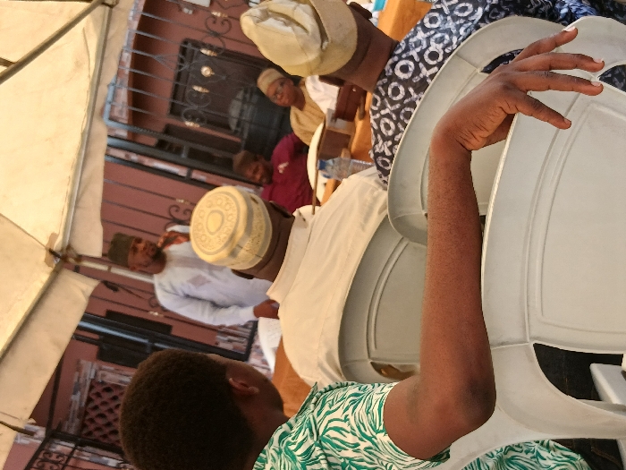 The image captures an outdoor gathering of at least seven individuals under a light-colored canopy. In the foreground, the back, right shoulder, and right arm of a person wearing a green and white patterned short-sleeved shirt are visible, with their arm resting on a white plastic chair. Two men are seated in the mid-ground, facing away from the camera, also on white plastic chairs; one wears a plain white garment and a light-colored, patterned cap, while the other wears a dark, patterned garment and a light-colored cap. A standing male figure with a short beard, wearing a light blue or grey long-sleeved garment with a patterned chest and a dark cap, addresses the seated group from the mid-ground, holding a dark object near his mouth. Behind the standing figure, a reddish-brown building with dark wrought-iron security features is visible. In the background, two additional individuals are partially visible, seated at a table with a light-colored covering; one wears a dark red shirt, and the other wears a light-colored garment and cap, with glasses. A clear plastic water bottle is present on the table. The specific location within the city of Lagos, Nigeria, is not identifiable from the visual evidence in the image.