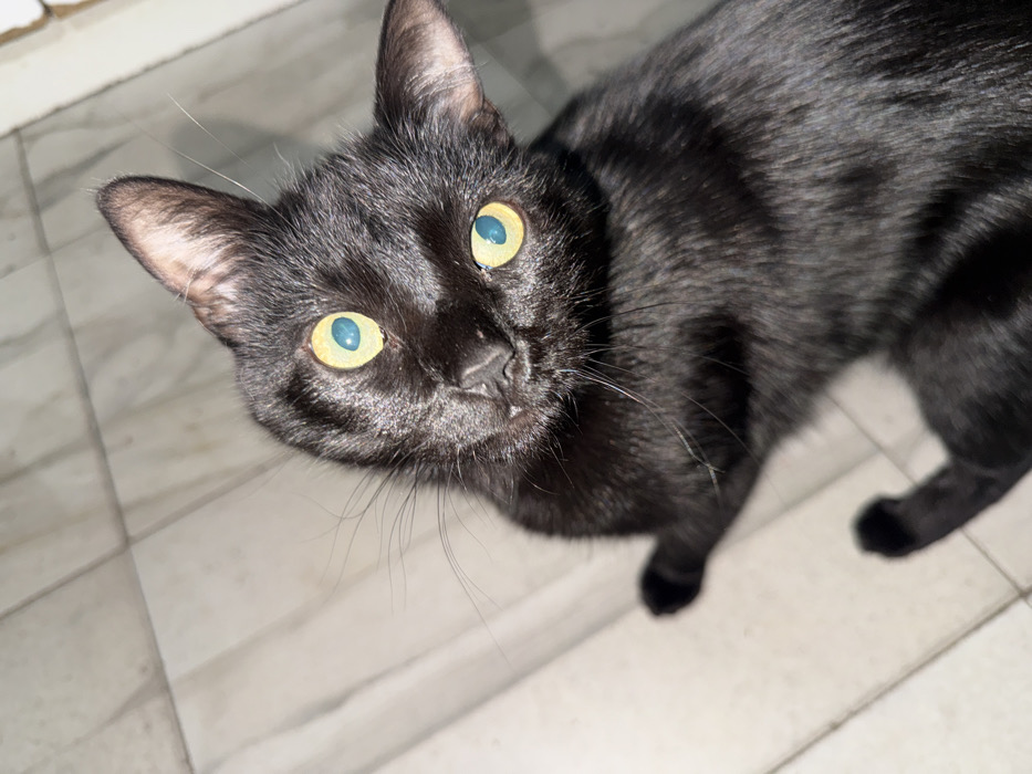 - "A domestic short-haired cat, black in color, is observed lying or sitting on a light-colored tiled floor with visible grout lines" by FM-UWaef1, licensed under CC BY 4.0