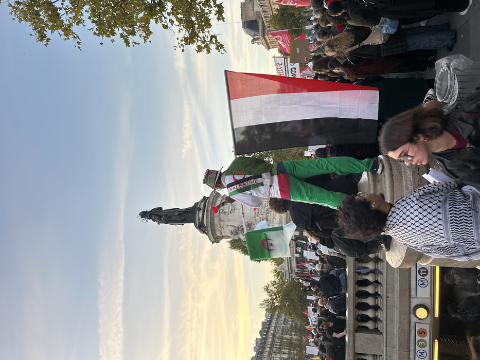 A wide-angle photograph depicts a large public demonstration taking place at Place de la République, Paris, France. The scene is dominated by the Monument à la République statue in the background and a visible Métro entrance (lines 3, 5, 11) in the foreground. The sky shows soft, diffused light of late afternoon or early evening with scattered clouds. A dense crowd of people occupies the square. In the mid-ground, slightly elevated on a structure and facing away from the camera, a male subject wears a white shirt, green tracksuit bottoms, and a green vest with "PALESTINE" printed on the back in white text. He wears a patterned hat and holds a red horn-like object. To his immediate right, a large flag with vertical black, white, and red stripes is displayed. To his left, an Algerian flag is visible, partially obscured by other individuals. In the immediate foreground, two individuals are partially visible. On the left, a person with dark, curly hair wears a keffiyeh and white earbuds. On the right, a person with dark hair and glasses looks towards the right of the frame. The background features typical Parisian architecture and autumn tree foliage on the right.