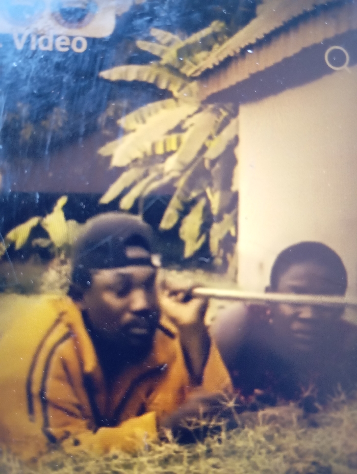Two dark-skinned men rest on grass, holding a silver pipe horizontally. The man on the left wears a black cap and yellow jacket with dark stripes. The man on the right has no shirt. Over them are banana tree leaves and a building's wall. The image, grainy and slightly faded, appears to be a photo of a phone screen displaying a video, as "video" and a record symbol are visible at the top.
