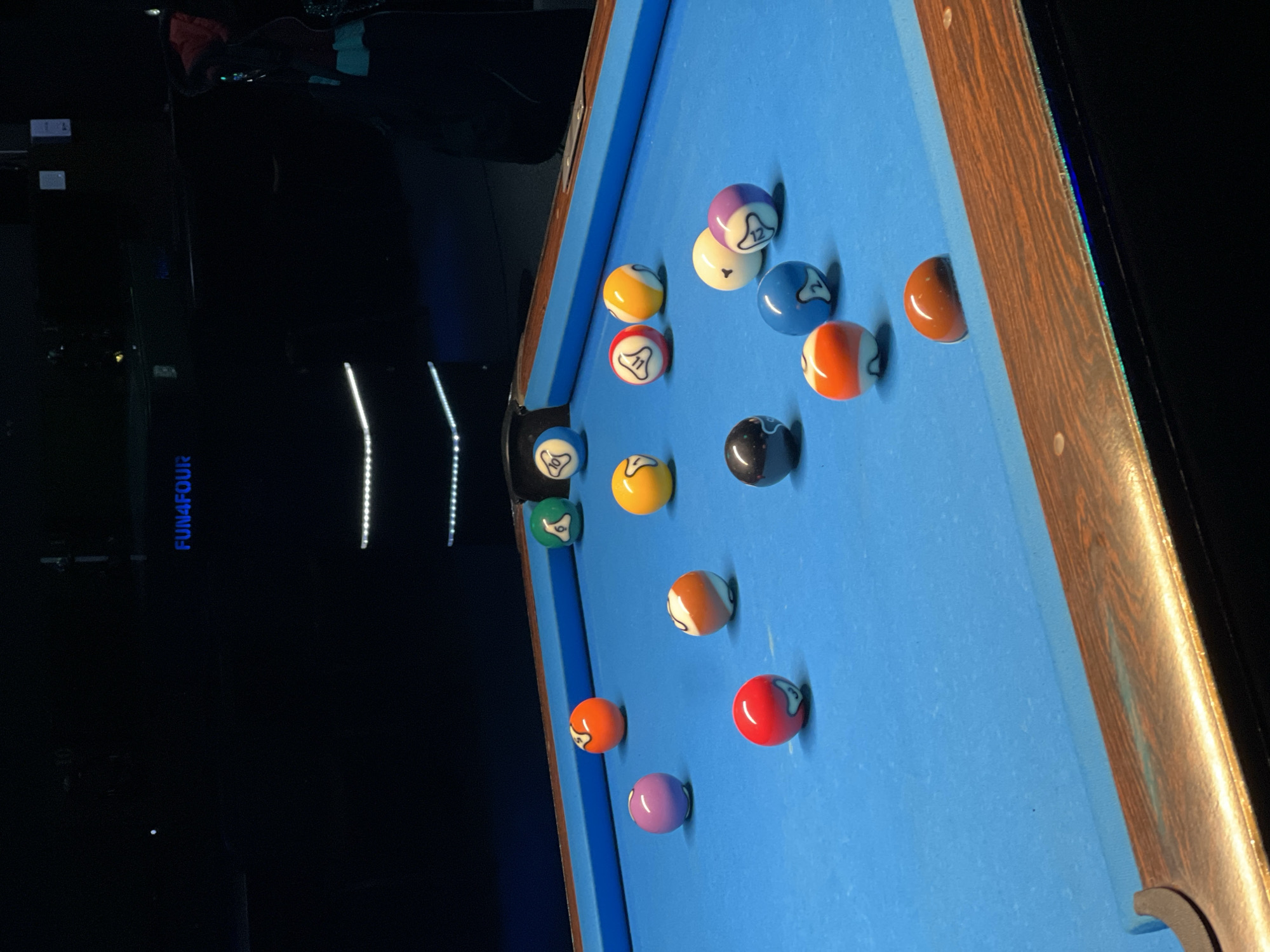 The image displays a billiard table with a vibrant blue felt playing surface, situated within an establishment in Yambol, Bulgaria. Numerous multicolored billiard balls are distributed across the table, indicating a game either in progress or recently concluded. A solid orange ball is partially resting within the foreground's right-side pocket. Visible balls include a purple ball, a solid red ball marked with a white symbol, a striped orange ball, a solid black ball, a solid yellow ball, a blue 2-ball, a purple 7-ball, a white cue ball bearing a distinct symbol, a solid green 6-ball, and a white 10-ball. The table features dark wooden rails with visible grain. The background is largely dark, with a blue illuminated text display spelling "FUN4FOUR" positioned above two vertically arranged horizontal LED light strips. A partially visible figure, adorned in red/orange and light blue attire, is discernible on the far right edge of the frame.