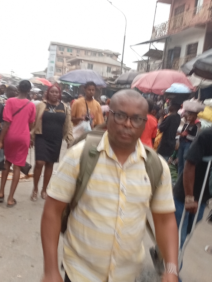 A bustling street scene depicts a crowded marketplace. A man in a yellow striped shirt and glasses walks towards the viewer, wearing a backpack. Several other people are visible in the background, including women in dresses and individuals carrying items on their heads. Umbrellas dot the scene, providing shade. The surrounding buildings add to the urban environment.