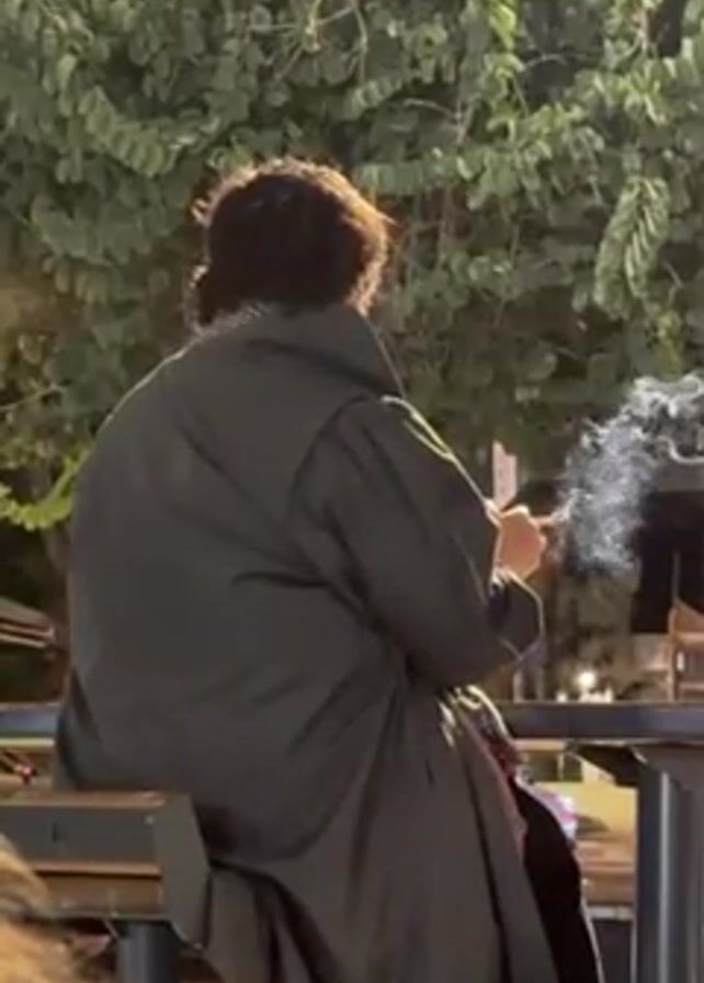 Here is a detailed description of the video: The video shows a person with dark, curly hair sitting on a bench and smoking. They are wearing a long, dark green coat. The person is viewed from behind, so their face is not visible. Smoke rises from the cigarette or joint they are holding. The bench is located outdoors, in what appears to be a public area. Behind the person is a dense green tree. The lighting suggests it is evening or nighttime. Another person's hair is visible in the bottom left of the frame. In the background, lights and parts of buildings can be seen.